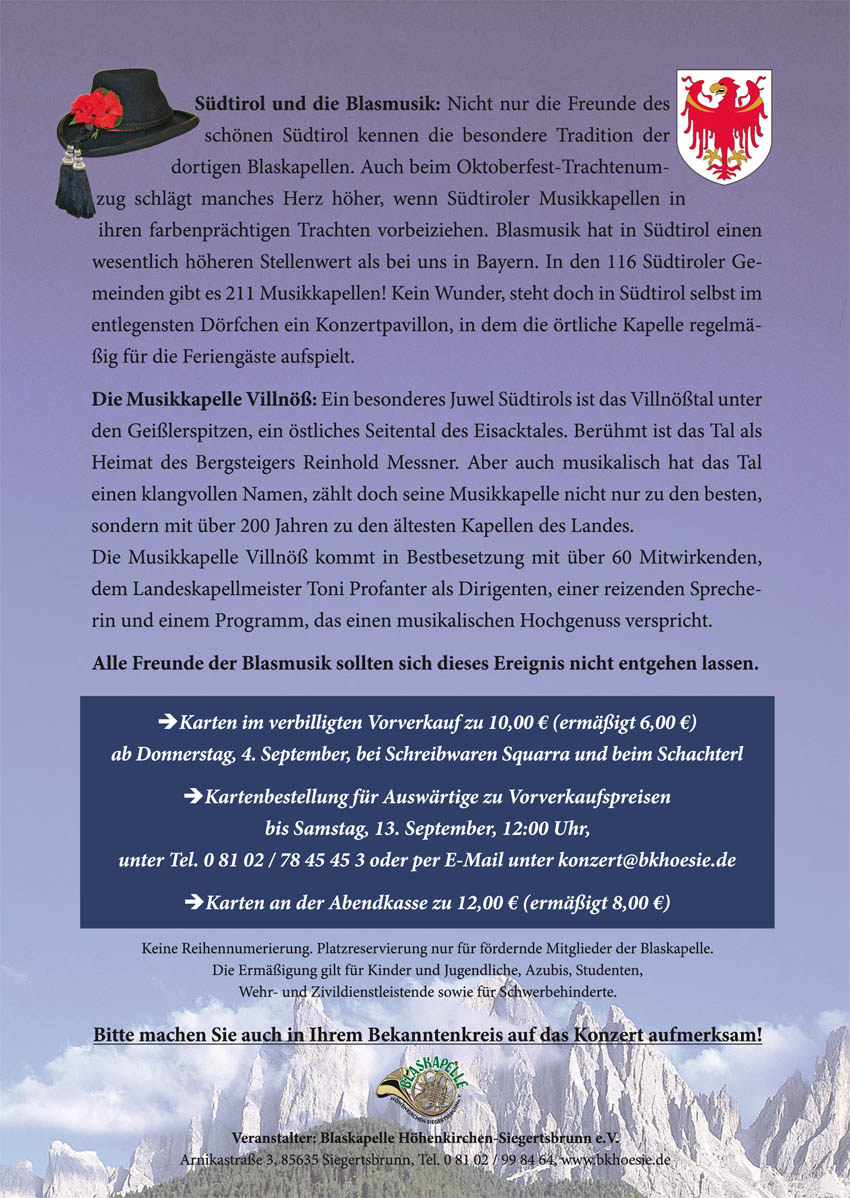 Südtirol und die Blasmusik: Nicht nur die Freunde des schönen Südtirols kennen die besondere Tradition der dortigen Blaskapellen. Auch beim Oktoberfest-Trachtenumzug schlägt manches Herz höher, wenn Südtiroler Musikkapellen in ihren farbenträchtigen Trachten vorbeiziehen. Blasmusik hat in Südtirol einen wesentlich höheren Stellenwert als bei uns in Bayern. In den 116 Südtiroler Gemeinden gibt es 211 Musikkapellen! Kein Wunder, steht doch in Südtirol selbst im entlegensten Dörfchen ein Konzertpavillon, in dem die örtliche Kapelle regelmäßig für die Feriengäste aufspielt.