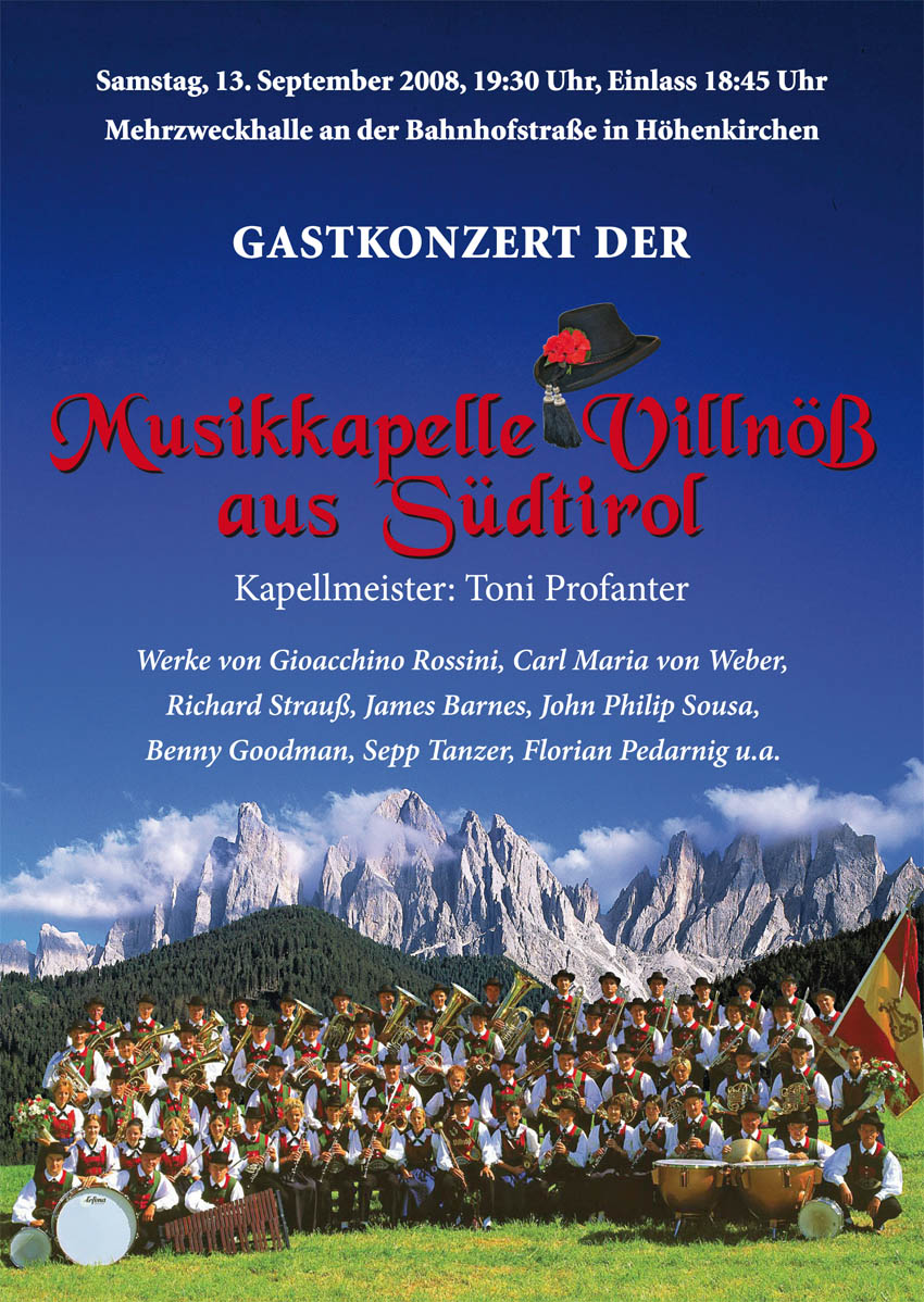 Die Musikkapelle Villnöß kommt in Bestbesetzung mit über 60 Mitwirkenden, den Landeskapellmeister Toni Profanter als Dirigenten, einer reizenden Sprecherin und einem Programm, das einen musikalischen Hochgenuss verspricht.