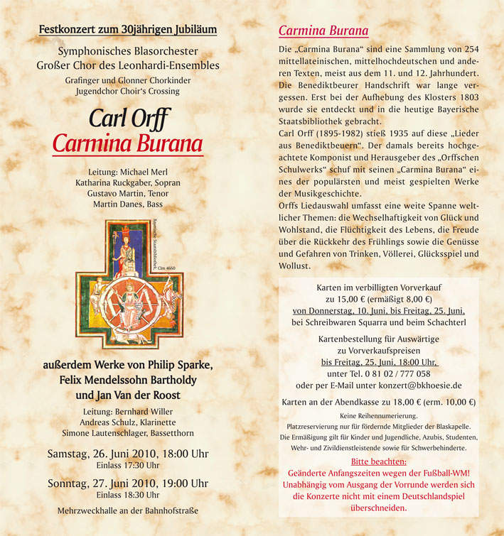 Die „Carmina Burana“ sind eine Sammlung von 254 mittellateinischen, mittelhochdeutschen und anderen Texten, meist aus dem 11. und 12. Jahrhundert. Die Benediktbeurer Handschrift war lange vergessen. Erst bei der Aufhebung des Klosters 1803 wurde sie entdeckt und in die heutige Bayerische Staatsbibliothek gebracht.