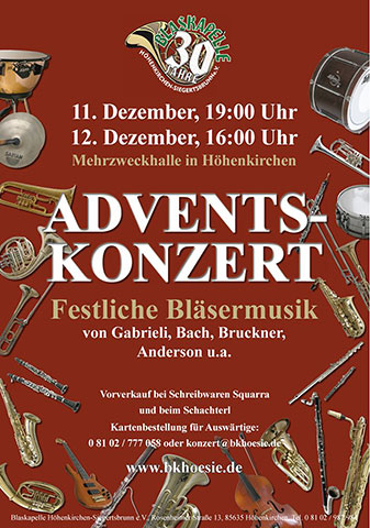 Warum nicht einmal wieder auf dieses bewährte Motto vergangener Jahre zurückgreifen? Zum Abschluß des Jubiläumsjahres „30 Jahre Blaskapelle Höhenkirchen-Siegertsbrunn“ laden das Jugendblasorchester und ein Gemeinschaftsorchester der „Großen“ zu einem Konzert mit festlicher vorweihnachtlicher Musik ein. Die bei Bläsern besonders beliebten Komponisten Gabrieli, Bach und Bruckner dürfen dabei natürlich nicht fehlen. Anstelle von Leroy Andersons Weihnachtshit „Sleighride“ erklingt dieses Jahr die nicht minder bekannte „Petersburger Schlittenfahrt“ von Richard Eilenberg, ebenfalls mit Schlittenglöckchen und Peitschenknall. Auf Leroy Anderson müssen die Besucher allerdings nicht verzichten: Er wird mit einer Auswahl internationaler Weihnachtslieder in interessanten Bearbeitungen für großes Holz- bzw. Blechbläserensemble vertreten sein.