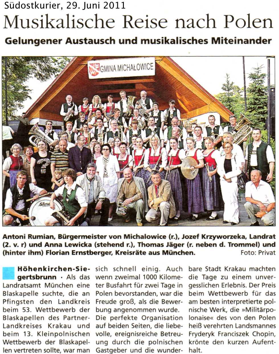 Als das Landratsamt München eine Blaskapelle suchte, die an Pfingsten den Landkreis beim 53. Wettbewerb der Blaskapellen des Partner-Landkreises Krakau und beim 13. Kleinpolnischen Wettbewerb der Blaskapellen vertreten sollte, war man sich schnell einig. Auch wenn zweimal 1000 Kilometer Busfahrt für zwei Tage in Polen bevorstanden, war die Freude groß, als die Bewerbung angenommen wurde. Die perfekte Organisation auf beiden Seiten, die liebevolle, ereignisreiche Betreuung durch die polnischen Gastgeber und die wunderbare Stadt Krakau machten die Tage zu einem unvergesslichen Erlebnis. Der Preis beim Wettbewerb für das am besten interpretierte polnische Werk, die „Militärpolonaise“ des von den Polen heiß verehrten Landsmannes Fryderyk Franciszek Chopin, krönte den kurzen Aufenthalt.