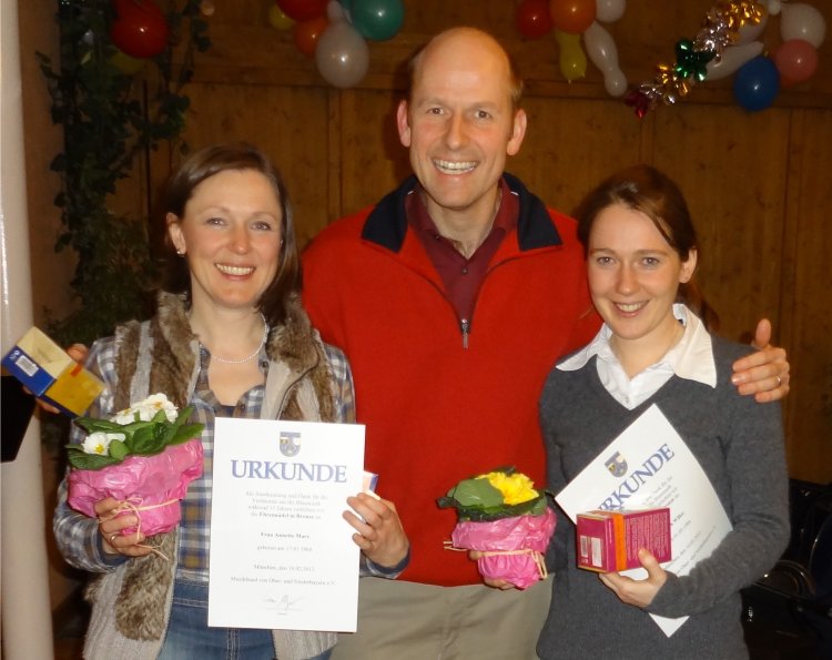 Annette Marx (li) und Elisabeth Willer erhielten für fünfzehnjährige Mitgliedschaft die Ehrennadel in Bronze, Florian Schnabel wurde für zehnjährige Mitgliedschaft gedankt.