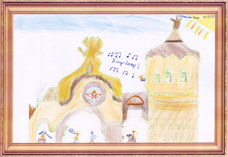 1. Preis: Sonja, 8 Jahre, "Das große Tor von Kiew". Besonders gut gefiel hier der Jury die Idee, den vorgegebenen Bilderrahmen zu durchbrechen.
