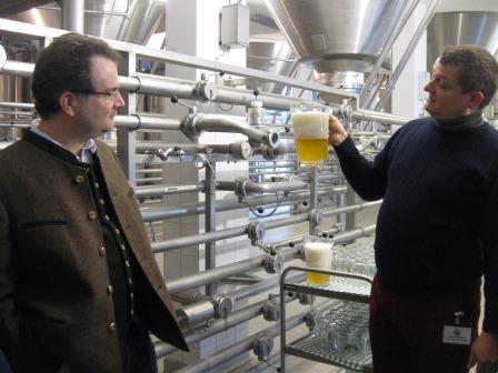 Gegen 10.00 h trafen wir uns vor der neuen Brauerei in Aying und wurden in zwei Gruppen geteilt durch die Brauerei geführt, wo uns sachkundig der komplexe Prozess des Bierbrauens erläutert wurde. Eine kleine Verkostung von Zwickelbier, das direkt aus der Brauanlage entnommen wurde, durfte natürlich nicht fehlen.