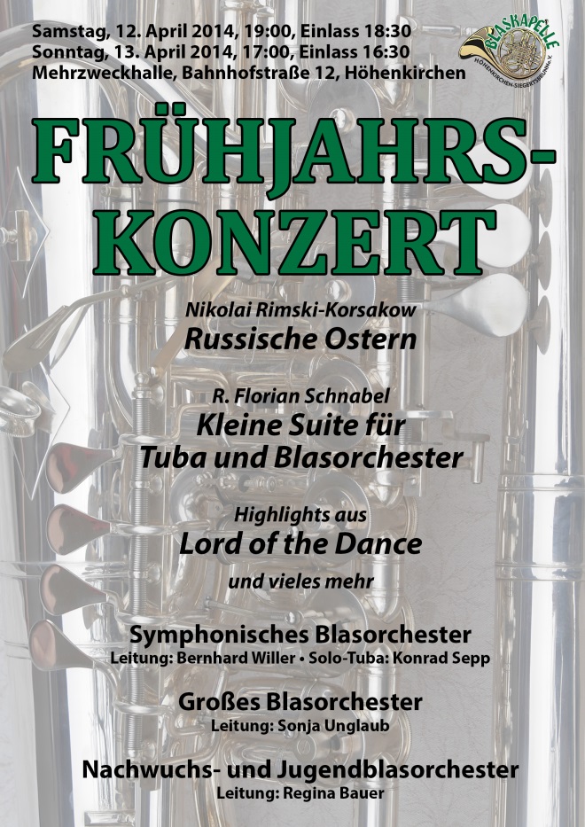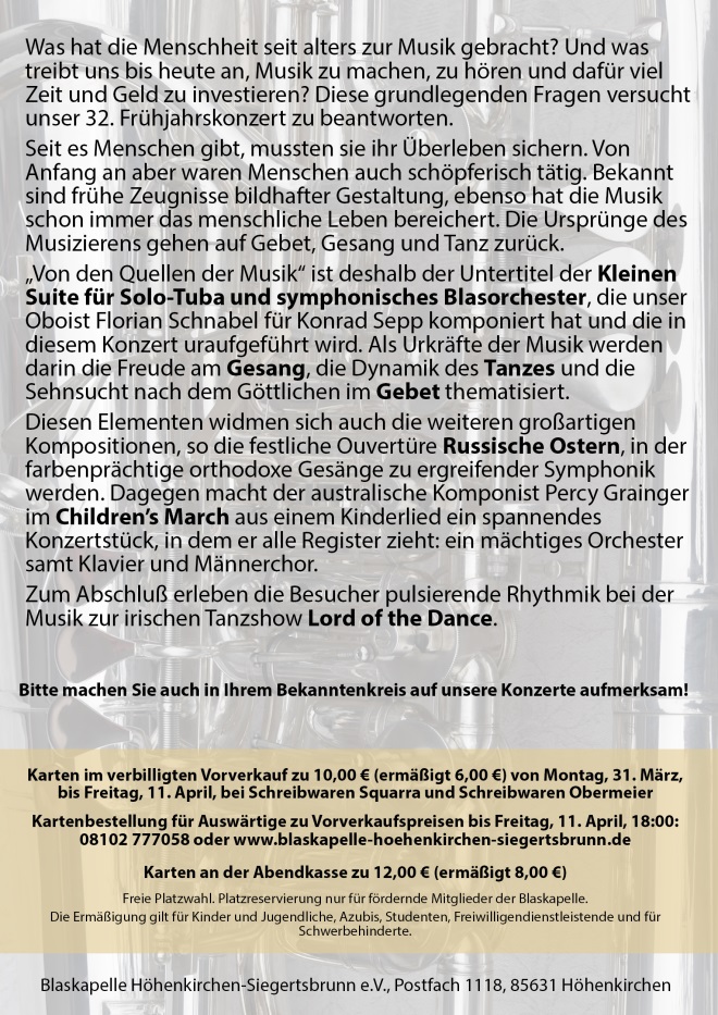 „Von den Quellen der Musik“ ist deshalb der Untertitel der Kleinen Suite für Solo-Tuba und symphonisches Blasorchester, die unser Oboist Florian Schnabel für Konrad Sepp komponiert hat und die in diesem Konzert uraufgeführt wird. Als Urkräfte der Musik werden darin die Freude am Gesang, die Dynamik des Tanzes und die Sehnsucht nach dem Göttlichen im Gebet thematisiert.