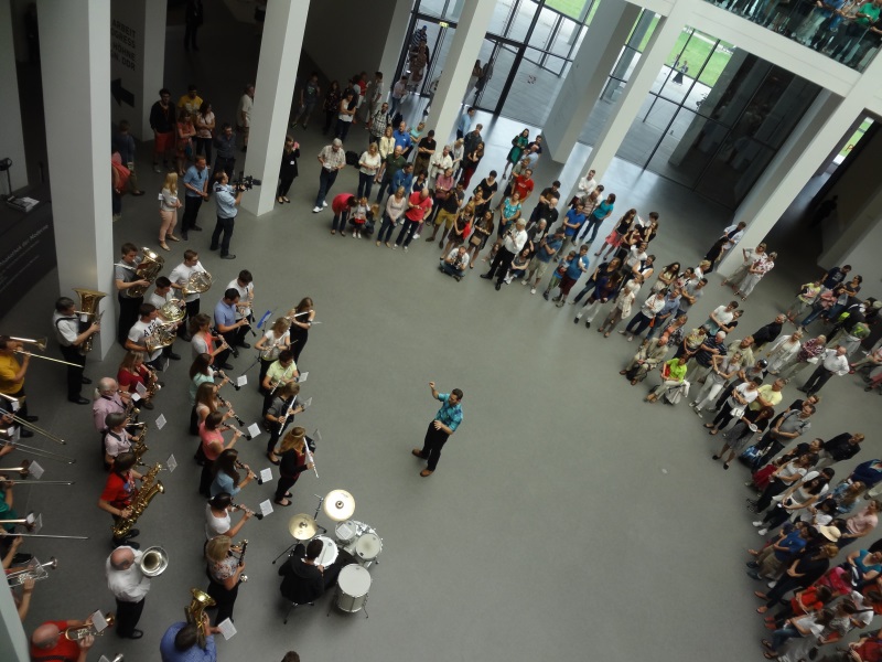 Eine ganz besondere und neue Erfahrung konnten die Mitglieder der Blaskapelle Anfang August sammeln, denn es hieß „Film ab“. Für die neue Werbekampagne der renommierten Firma „Eilles“ drehten sie in der Pinakothek der Moderne ein Video. Während der vier Stunden lernten die sechzig Teilnehmer an jenem heißen Sonntag, was es heißt, einen „spontanen“ Flashmob zu inszenieren, und natürlich auch, wie viel Spaß das machen kann. Auch wenn die Dreharbeiten sehr entspannt verliefen – es dauerte, bis das Material „im Kasten“ war.