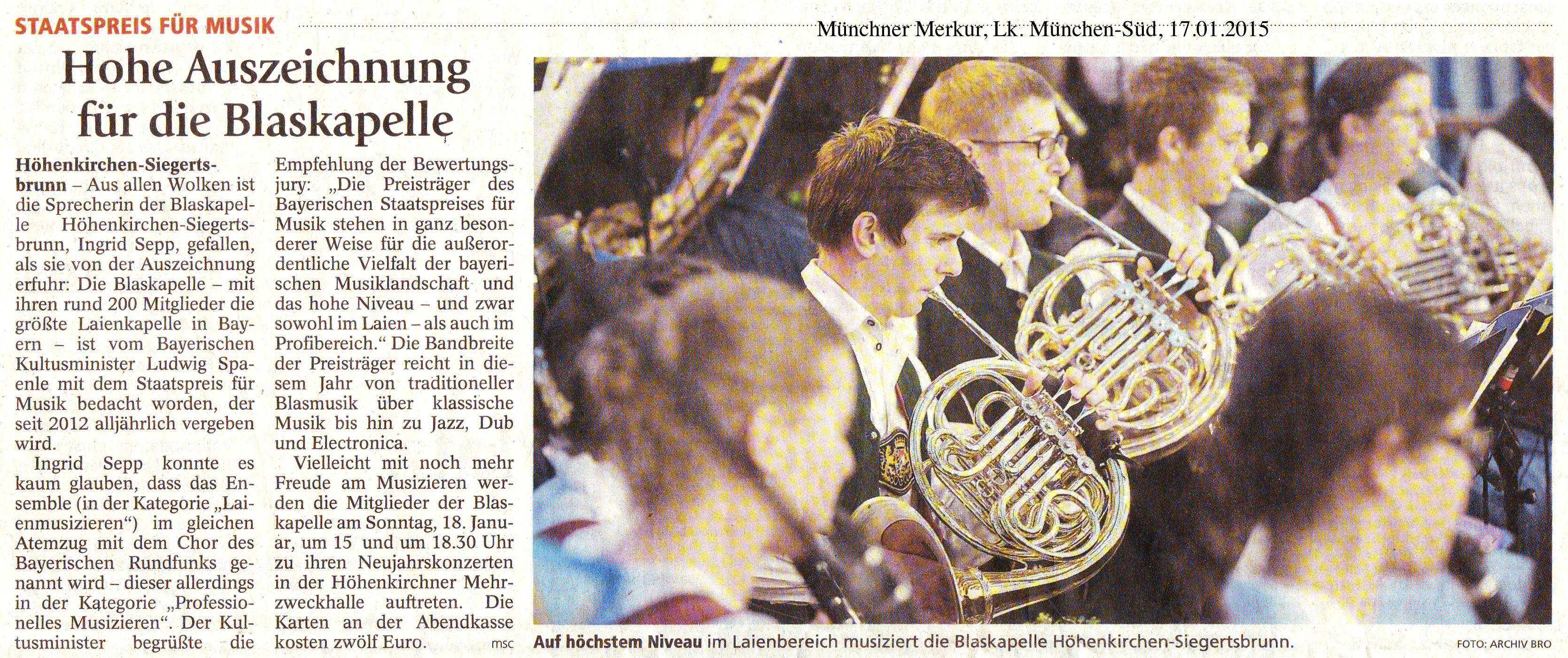 Höhenkirchen-Siegertsbrunn – Aus allen Wolken ist die Sprecherin der Blaskapelle Höhenkirchen-Siegertsbrunn, Ingrid Sepp, gefallen, als sie von der Auszeichnung erfuhr: Die Blaskapelle – mit ihren rund 200 Mitglieder die größte Laienkapelle in Bayern – ist vom Bayerischen Kultusminister Ludwig Spaenle mit dem Staatspreis für Musik bedacht worden, der seit 2012 alljährlich vergeben wird.