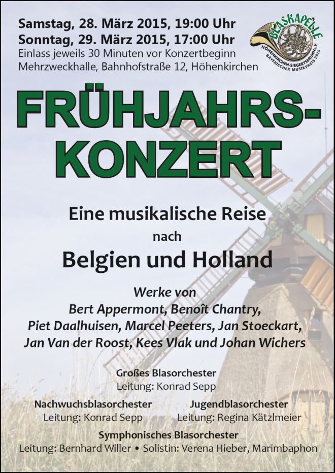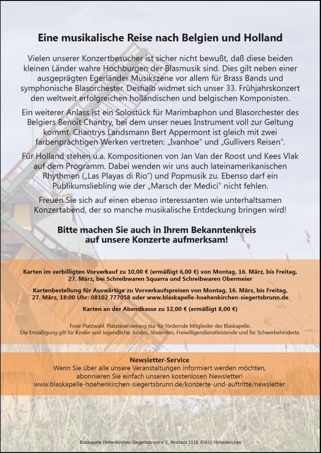 Vielen unserer Konzertbesucher ist sicher nicht bewußt, daß diese beiden kleinen Länder wahre Hochburgen der Blasmusik sind. Dies gilt neben einer ausgeprägten Egerländer Musikszene vor allem für Brass Bands und symphonische Blasorchester. Deshalb widmet sich unser 33. Frühjahrskonzert den weltweit erfolgreichen holländischen und belgischen Komponisten.