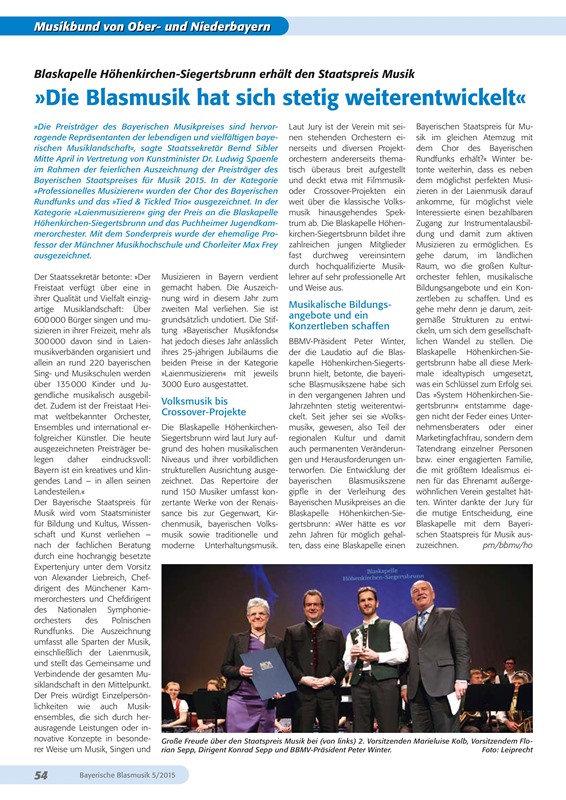 Die Blaskapelle Höhenkirchen-Siegertsbrunn wird laut Jury aufgrund des hohen musikalischen Niveaus und ihrer vorbildlichen strukturellen Ausrichtung ausgezeichnet. Das Repertoire der rund 150 Musiker umfasst konzertante Werke von der Renaissance bis zur Gegenwart, Kirchenmusik, bayerischen Volksmusik sowie traditionelle und moderne Unterhaltungsmusik.