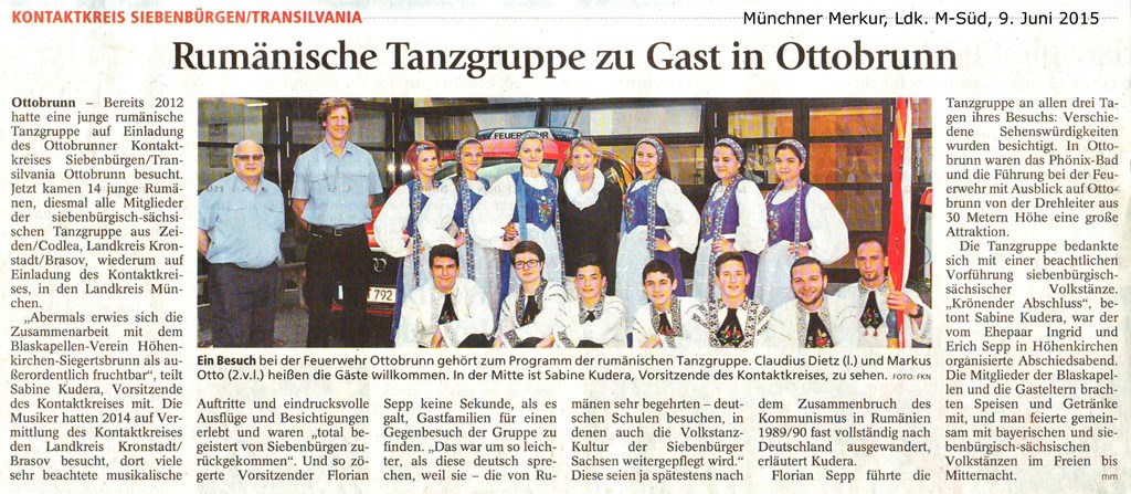 „Abermals erwies sich die Zusammenarbeit mit dem Blaskapellen-Verein Höhenkirchen-Siegertsbrunn als außerordentlich fruchtbar“, teilt Sabine Kudera, Vorsitzende des Kontaktkreises mit. Die Musiker hatten 2014 auf Vermittlung des Kontaktkreises den Landkreis Kronstadt/ Brasov besucht, dort viele sehr beachtete musikalische Auftritte und eindrucksvolle Ausflüge und Besichtigungen erlebt und waren „total begeistert von Siebenbürgen zurückgekommen“. Und so zögerte Vorsitzender Florian Sepp keine Sekunde, als es galt, Gastfamilien für einen Gegenbesuch der Gruppe zu finden. „Das war um so leichter, als diese deutsch sprechen, weil sie – die von Rumänen sehr begehrten – deutschen Schulen besuchen, in denen auch die Volkstanz-Kultur der Siebenbürger Sachsen weitergepflegt wird.“ Diese seien ja spätestens nach dem Zusammenbruch des Kommunismus in Rumänien 1989/90 fast vollständig nach Deutschland ausgewandert, erläutert Kudera.