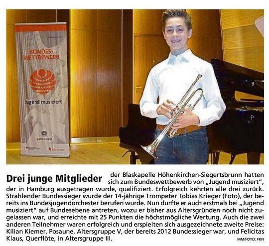 Drei junge Mitglieder der Blaskapelle Höhenkirchen-Siegertsbrunn hatten sich zum Bundeswettbewerb von „Jugend musiziert“, der in Hamburg ausgetragen wurde, qualifiziert. Erfolgreich kehrten alle drei zurück. Strahlender Bundessieger wurde der 14-jährige Trompeter Tobias Krieger (Foto), der bereits ins Bundesjugendorchester berufen wurde. Nun durfte er auch erstmals bei „Jugend musiziert“ auf Bundesebene antreten, wozu er aus Altergründen bisher noch nicht zugelassen war, und erreichte mit 25 Punkten die höchstmögliche Wertung. Auch die zwei anderen Teilnehmer waren erfolgreich und erspielten sich ausgezeichnete zweite Preise: Kilian Kiemer, Posaune, Altersgruppe V, der bereits 2012 Bundessieger war, und Felicitas Klaus, Querflöte, in Altersgruppe III.