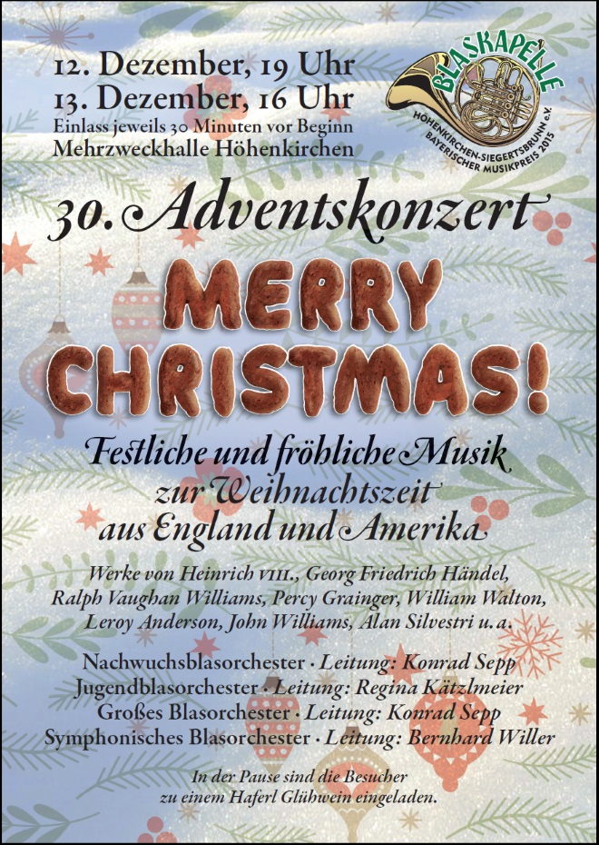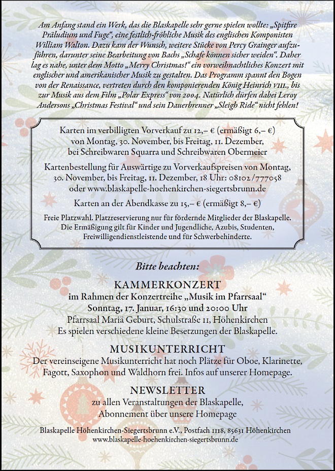 Am Anfang stand ein Werk, das die Blaskapelle sehr gerne spielen wollte – „Spitfire Präludium und Fuge“, eine festlich-fröhliche Musik des englischen Komponisten William Walton. Dazu kam der Wunsch, weitere Stücke von Percy Grainger aufzuführen, darunter seine Bearbeitung von Bachs „Schafe können sicher weiden“. Daher lag es nahe, unter dem Motto „Merry Christmas!“ ein vorweihnachtliches Konzert mit englischer und amerikanischer Musik zu gestalten. Das Programm spannt den Bogen von der Renaissance, vertreten durch den komponierenden König Heinrich VIII., bis zur Musik aus dem Film „Polar Express“ von 2004. Natürlich dürfen dabei Leroy Andersons „Christmas Festival“ und sein Dauerbrenner „Sleigh Ride“ nicht fehlen!