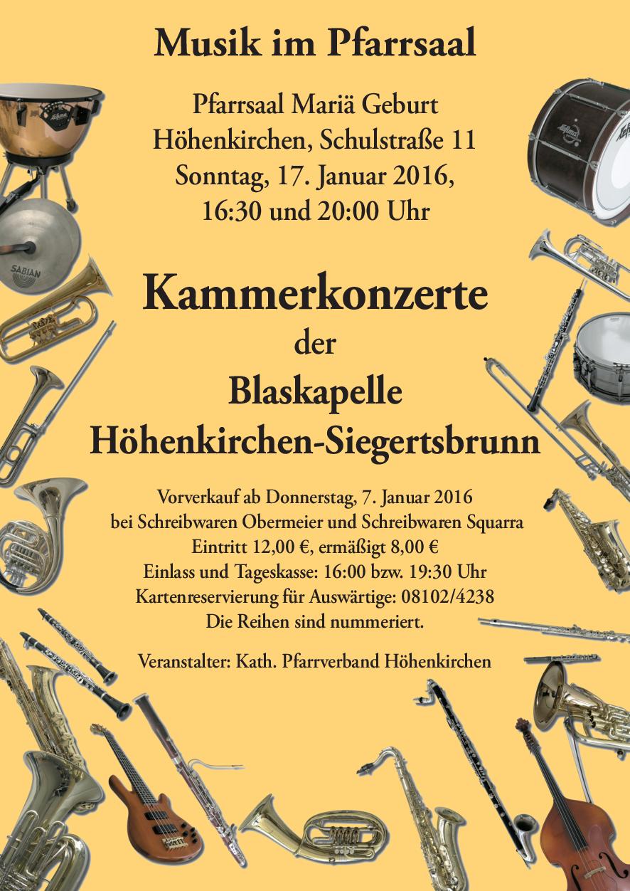 Da Ostern 2016 besonders früh liegt, muss das Neujahrskonzert in der Mehrzweckhalle aus probentechnischen Gründen entfallen. Zum Ausgleich ist für das Frühjahrskonzert am 19./20. März 2016 ein sehr unterhaltsames Programm geplant.