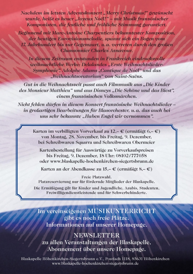 Nicht fehlen dürfen in diesem Konzert französische Weihnachtslieder – in großartigen Bearbeitungen für Blasorchester, u.a. das auch bei uns sehr bekannte „Haben Engel wir vernommen“.