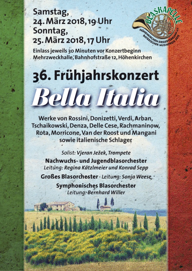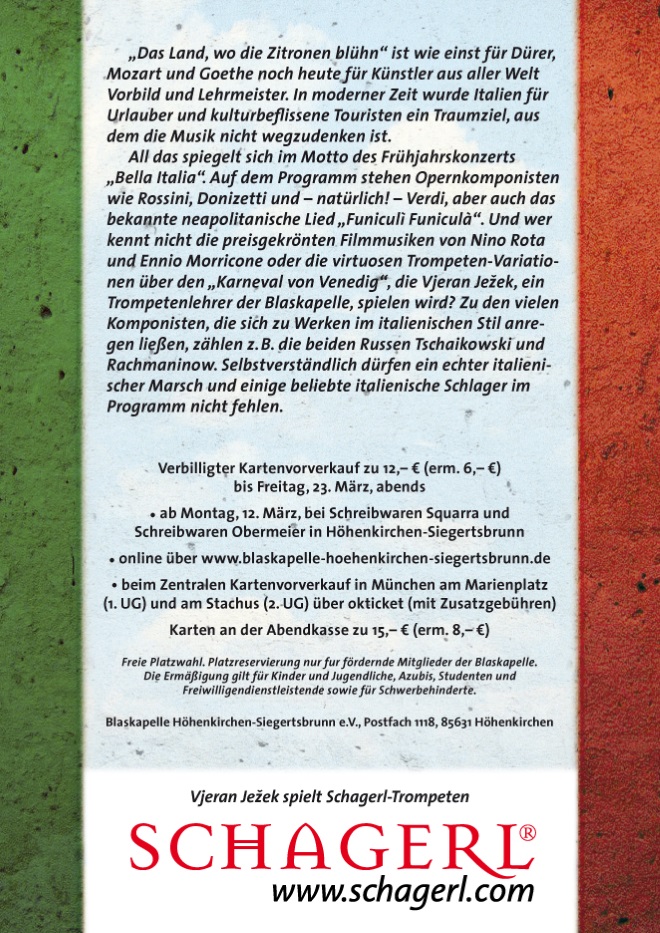 All das spiegelt sich im Motto des Frühjahrskonzerts „Bella Italia“. Auf dem Programm stehen Opernkomponisten wie Rossini, Donizetti und – natürlich! – Verdi, aber auch das bekannte neapolitanische Lied „Funiculì Funiculà“. Und wer kennt nicht die preisgekrönten Filmmusiken von Nino Rota und Ennio Morricone oder die virtuosen Trompeten-Variationen über den „Karneval von Venedig“, die Vjeran Ježek, ein Trompetenlehrer der Blaskapelle, spielen wird? Zu den vielen Komponisten, die sich zu Werken im italienischen Stil anregen ließen, zählen z. B. die beiden Russen Tschaikowski und Rachmaninow. Selbstverständlich dürfen ein echter italienischer Marsch und einige beliebte italienische Schlager im Programm nicht fehlen.