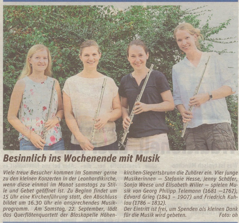 Im September lädt das Querflötenquartett der Blaskapelle Höhenkirchen-Siegertsbrunn die Zuhörer ein. Vier junge Musikerinnen, Stefanie Hesse, Jenny Schäfer, Sonja Weese und Elisabeth Willer spielen Musik von  Georg Philipp Telemann (1681-1767), Edvard Grieg (1843–1907) und Friedrich Kuhlau (1786–1832).