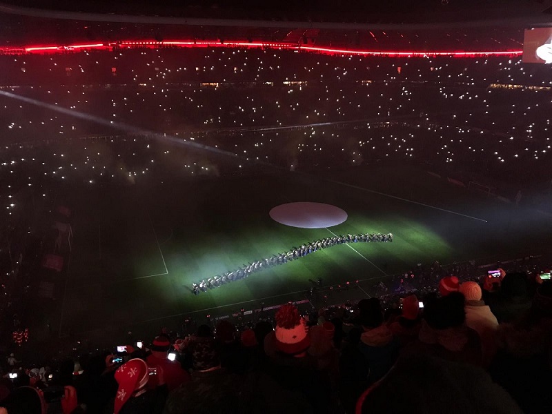 Die aufwändige Weihnachtsshow nach dem Schlusspfiff lief diesmal etwas anders als im Vorjahr ab. Nach einer dramatischen Einleitung durch eine Lichtshow und den langsamen Bewegungen riesiger Dundo-Puppen wirkte die Blaskapelle an einem Flashmob zu „Fröhliche Weihnacht“ mit Solo-Künstlern u. a. an der E-Gitarre, Akkordeon und Zither mit. In Zweierreihen marschierten die rund 70 Musiker hinaus auf den Rasen und spielten ihren Teil des Weihnachtsliedes – nur wenige Sekunden zwar, aber die waren so eindrucksvoll, dass sie lange nachwirkten. Wann hat man schon die Möglichkeit, im ausverkauften Fußballstadion ein Weihnachtslied zu spielen?