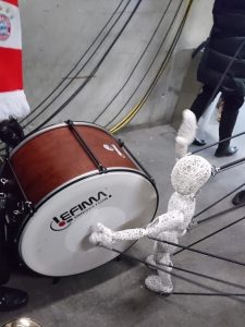 Viele Musiker der Blaskapelle hatten bereits bei der letztjährigen Weihnachtsshow mitgewirkt. Dennoch freuten sich alle und konnten im Gang zum Spielfeld kaum stillstehen. Zusätzlich durften die Musiker hautnah miterleben, wie das entscheidende 1:0 für den FC Bayern München fiel. Nach kurzem Warten, aber mit nettem Zeitvertreib durch die Dundo-Puppen im Gang, ging es dann endlich los.