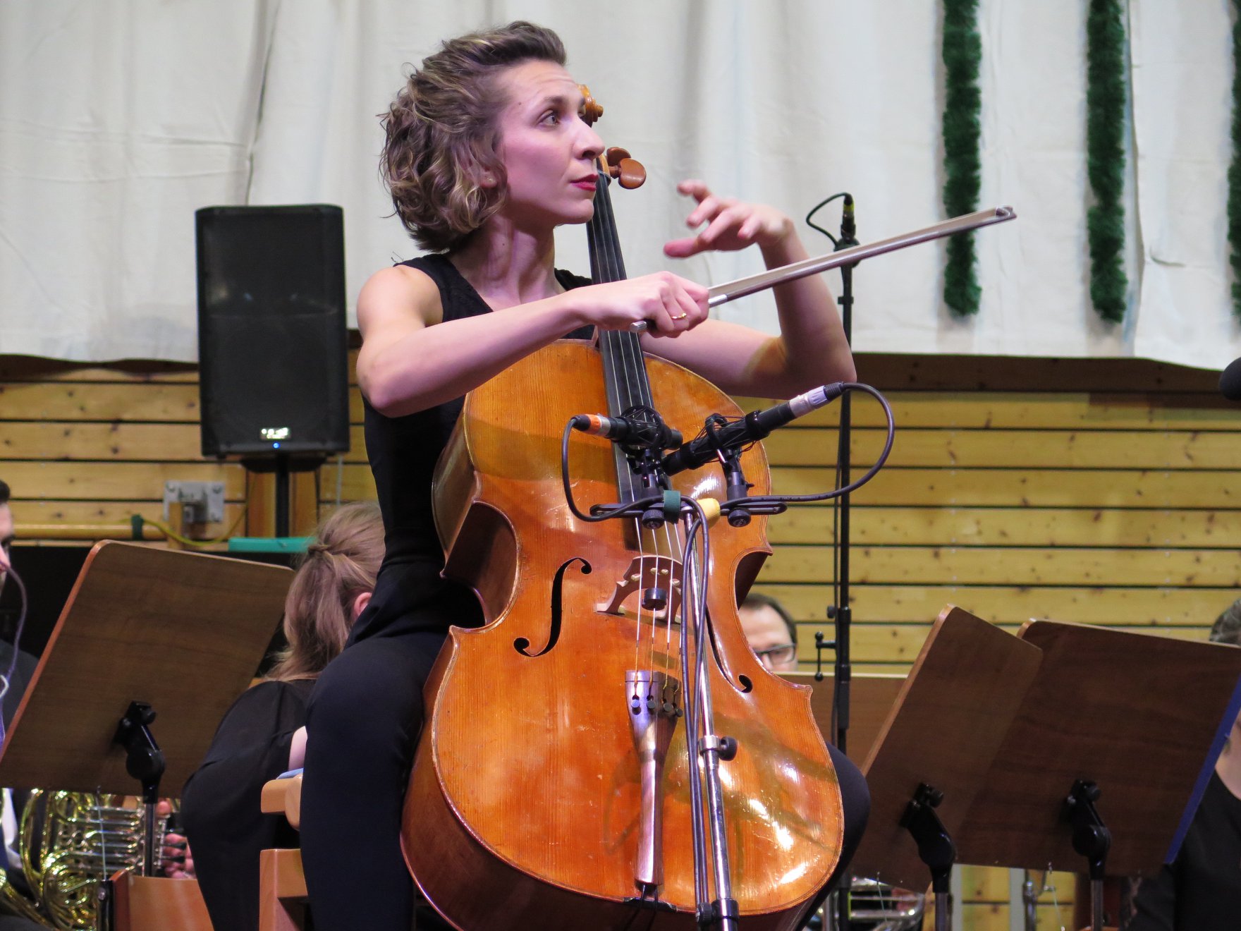 Cello zu Blasmusik? Ein gewagtes Experiment. Dass aber aus Wagnissen Erlebnisse werden können, bewies am Sonntag die Blaskapelle bei ihrem diesjährigen Neujahrskonzert. Sie hatte die Cello-Virtuosin Maria Well eingeladen, gemeinsam mit einer Blasorchesterauswahl die erste Hälfte mit dem „Konzert für Violoncello und Blasorchester“ von Friedrich Gulda zu bestreiten. Das Werk zog die Zuhörer durch seinen Wechsel zwischen fetzigem Funkrock, almerischen Landlerweisen, deftiger Marschmusik und klassischem Menuett immer mehr in seinen Bann, zumal die Solistin die musikalischen Kapriolen der Komposition hinreißend interpretierte. Insbesondere im dritten Satz, der groß angelegten Cadenza für Cello solo, überzeugte Maria Well mit perfekter Virtuosität und dem einschmeichelnden, wunderbar warmen Gesang ihres Instruments. Die Spielfreude der 12 Bläser, dazu Gitarre, Kontrabass und Schlagzeug unter der Leitung von Bernhard Willer war nicht zu übersehen. Stehende Ovationen! Mit der Sarabande aus der Suite für Violoncello solo 1 von Johann Sebastian Bach als Zugabe zog Maria Well noch einmal alle Register.