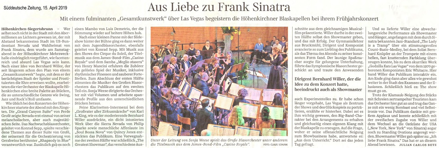 Höhenkirchen-Siegertsbrunn – Wer selbst noch nicht in der Stadt mit den Abermillionen an Lichtern gewesen ist, der mit Abstand bekanntesten Stadt im US-Bundesstaat Nevada und Wahlheimat von Frank Sinatra, dem wurde am Samstagabend in der Höhenkirchner Mehrzweckhalle eindringlich vorgeführt, wie facettenreich und absurd Las Vegas sein kann. Nach einer Idee von Bernhard Willer, der seit längerem schon den Plan von einem „Gesamtkunstwerk“ hegte, mit dem er der berüchtigten Stadt der Spieler und Prostituierten die Ehre erweisen wollte, erarbeiteten die vier Orchester der Blaskapelle Höhenkirchen eine breite Palette an Stücken, die so unterschiedliche Genres wie Swing, Jazz und Rock’n’Roll umfasste.