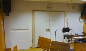 Hinter dem Dirigenten ist die Schaumstoffverkleidung von Wand und Tür zu erkennen. Verwendet wurden Absorberplatten aus schwer entflammbaren Basotect-Schaumstoff.