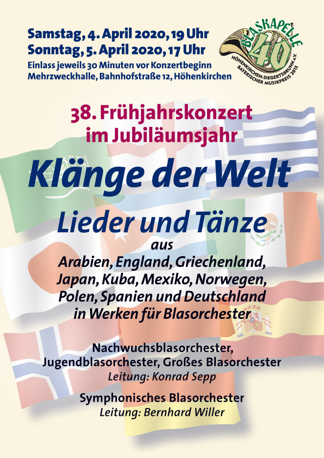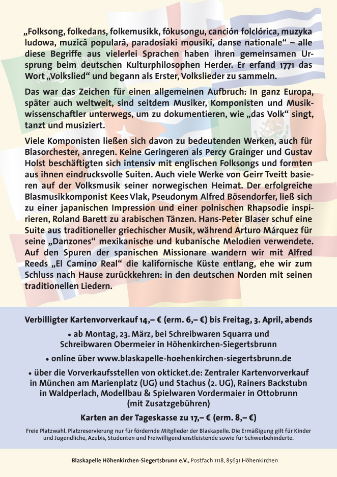 Viele Komponisten ließen sich davon zu bedeutenden Werken, auch für Blasorchester, anregen. Keine Geringeren als Percy Grainger und Gustav Holst beschäftigten sich intensiv mit englischen Folksongs und formten aus ihnen eindrucksvolle Suiten. Auch viele Werke von Geirr Tveitt basieren auf der Volksmusik seiner norwegischen Heimat. Der erfolgreiche Blasmusikkomponist Kees Vlak, Pseudonym Alfred Bösendorfer, ließ sich zu einer japanischen Impression und einer polnischen Rhapsodie inspirieren, Roland Barett zu arabischen Tänzen. Hans-Peter Blaser schuf eine Suite aus traditioneller griechischer Musik, während Arturo Márquez für seine „Danzones“ mexikanische und kubanische Melodien verwendete. Auf den Spuren der spanischen Missionare wandern wir mit Alfred Reeds „El Camino Real“ die kalifornische Küste entlang, ehe wir zum Schluss nach Hause zurückkehren: in den deutschen Norden mit seinen traditionellen Liedern.