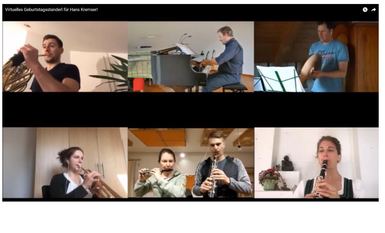 Für das Standerl spielten über 40 Musiker der Blaskapelle zu Hause „Happy birthday“ und „Hoch soll er leben“ ein. Dazu gab es eine Playbackvorlage mit Metronom-Klick, um das einheitliche Tempo zu gewährleisten. Die Musiker nahmen sich mit Handy oder Kamera auf und hörten dazu die Playbackvorlage über Kopfhörer. Die Nachbearbeitung übernahmen zwei junge Aktive, die dafür eine Nachtschicht einlegten.