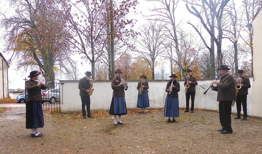 Seit über 25 Jahren ist es nun schon Tradition, dass die Blaskapelle auf allen Friedhöfen der Gemeinde die liturgische Feier umrahmt, während die Bürgerinnen und Bürger an den Gräbern der Toten gedenken. Auch in Brunnthal und Harthausen sind die Musiker seit Jahren zu Gast. Heuer standen die Gräberumgänge für die Musiker unter einem besonderen Vorzeichen, waren sie doch die letzten Auftritte vor dem erneuten Lockdown und der damit einhergehenden Zwangspause für das musikalische Leben.