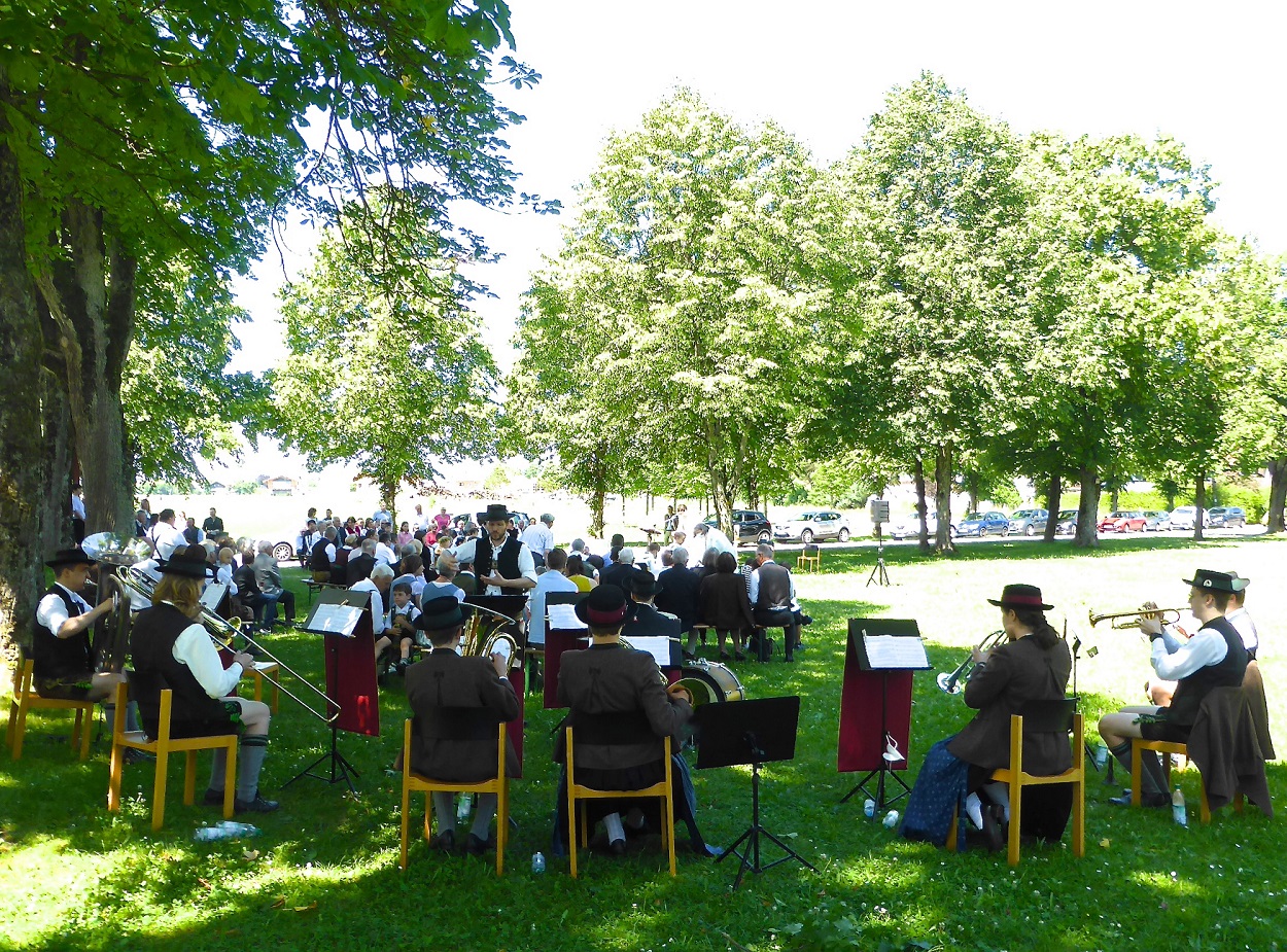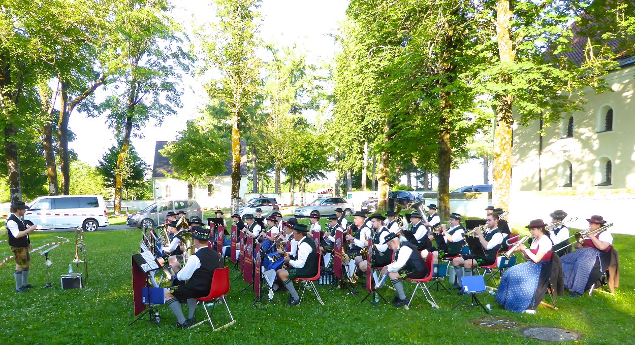 Auf der Leonhardiwiese gestalteten sieben Blechbläser und teilweise auch ein Schlagzeuger vier Erstkommunionsfeiern des Pfarrverbandes – für alle Beteiligten dank des wunderbaren Wetters und der idyllischen Atmosphäre sicher unvergesslich.